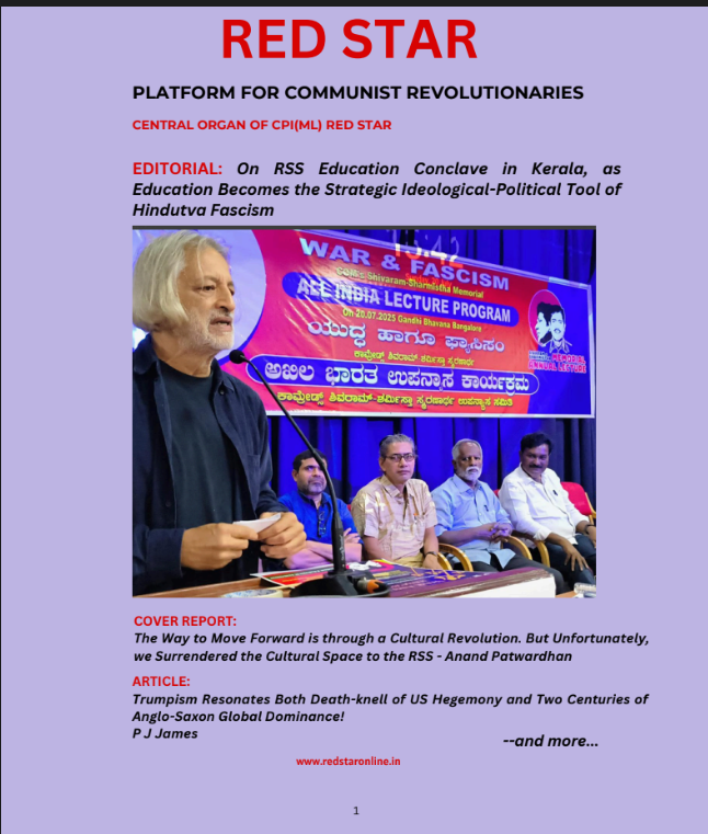 FeaturedPeriodicalsRed Star English Monthly Redstar English Monthly – August 2025 Issue by admin August 1, 2025 written by admin August 1, 2025 For reading and downloading the magazine, Click here… 0 comment 1 FacebookTwitterPinterestEmail admin previous post All India krantikari Kisan Sabha (AIKKS) Telangana state enlarge committee meeting next post The condition and direction of the tribals at the international and all India level – Tuhin Related Articles Redstar Hindi – March 2026 Issue March 6, 2026 Redstar English – March, 2026 – Issue March 1, 2026 The Comity of Nations Should Urgently Step in... February 28, 2026 Massive Protest by Farmers’ and Workers’ Organisations under... February 23, 2026 Strengthening Hindutva-Zionist Nexus Behind India’s Abstention from Latest... February 20, 2026 Demonstration Held in Raipur by Moolnivasi Sangh Chhattisgarh... February 20, 2026 CPI (ML) Red Star salutes the working class,... February 13, 2026 All India Workers’ Strike – Bilaspur, Chhattisgarh February 12, 2026 Red Star Magazine – February, 2026 Issue February 9, 2026 13th Party Congress of CPI (ML) Red Star February 5, 2026 Leave a Comment Cancel Reply Save my name, email, and website in this browser for the next time I comment.
