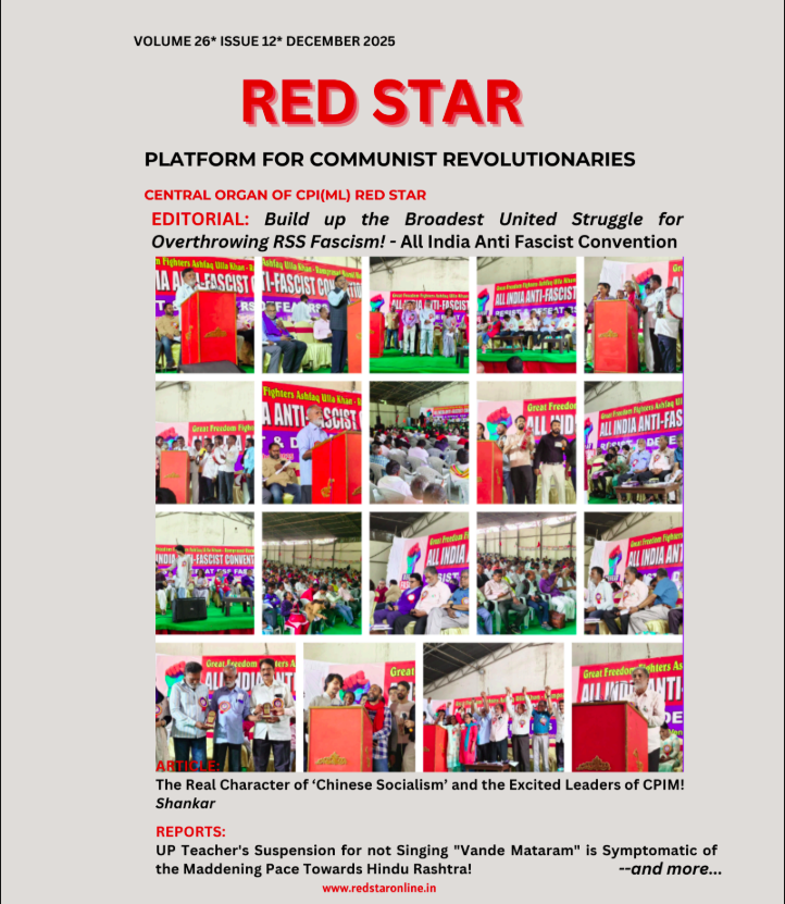 FeaturedPeriodicalsRed Star English Monthly Redstar English Monthly – December 2025 Issue by admin December 9, 2025 written by admin December 9, 2025 For reading and downloading the magazine, Click here… 0 comment 2 FacebookTwitterPinterestEmail admin previous post Build up the Broadest United Struggle for Overthrowing RSS Fascism! — All India Anti Fascist Convention next post Karnataka Raitha Sangha AIKKS Taluk Samiti Maski Related Articles Redstar Hindi – March 2026 Issue March 6, 2026 Redstar English – March, 2026 – Issue March 1, 2026 The Comity of Nations Should Urgently Step in... February 28, 2026 Massive Protest by Farmers’ and Workers’ Organisations under... February 23, 2026 Strengthening Hindutva-Zionist Nexus Behind India’s Abstention from Latest... February 20, 2026 Demonstration Held in Raipur by Moolnivasi Sangh Chhattisgarh... February 20, 2026 CPI (ML) Red Star salutes the working class,... February 13, 2026 All India Workers’ Strike – Bilaspur, Chhattisgarh February 12, 2026 Red Star Magazine – February, 2026 Issue February 9, 2026 13th Party Congress of CPI (ML) Red Star February 5, 2026 Leave a Comment Cancel Reply Save my name, email, and website in this browser for the next time I comment.