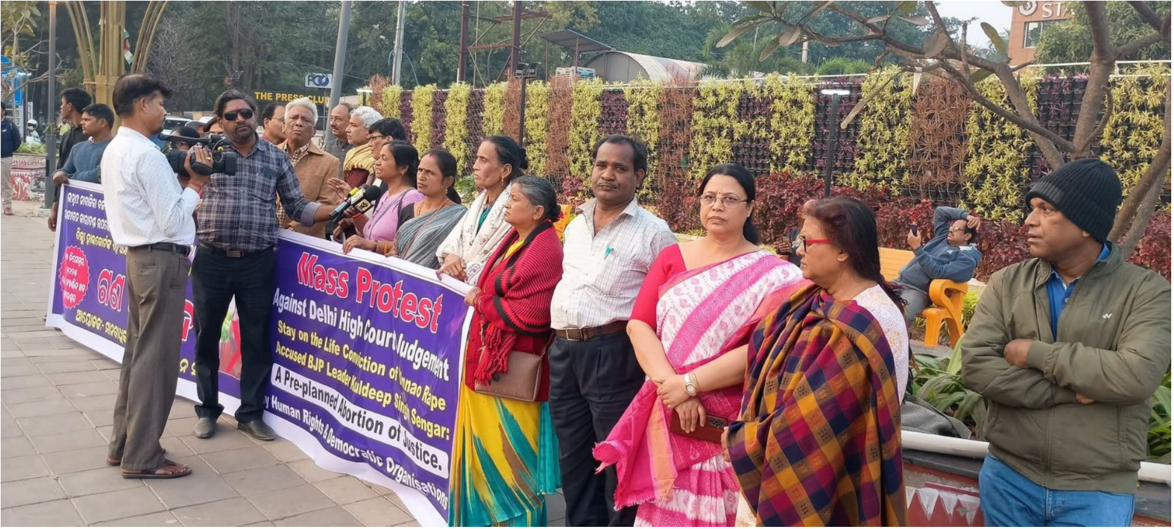 Bhubaneswar, 27/12/25: The stay on life imprisonment of BJP leader and former MLA Kuldeep Singh Sengar in the Unnao minor rape case in Uttar Pradesh has been opposed by various human rights and democratic organizations. Branding it as a planned murder of the judicial system and a miscarriage of justice, a mass protest was organized today at Protest Square (Master Canteen Chowk) in Bhubaneswar against this inhumane and unjust order.