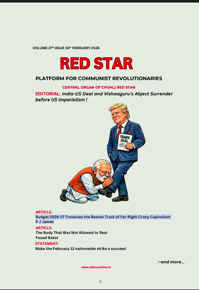 FeaturedPeriodicalsRed Star English Monthly Red Star Magazine – February, 2026 Issue by admin February 9, 2026 written by admin February 9, 2026 For reading and downloading the magazine, Click here… 0 comment 0 FacebookTwitterPinterestEmail admin previous post 13th Party Congress of CPI (ML) Red Star next post All India Workers’ Strike – Bilaspur, Chhattisgarh Related Articles Redstar Hindi – March 2026 Issue March 6, 2026 Redstar English – March, 2026 – Issue March 1, 2026 The Comity of Nations Should Urgently Step in... February 28, 2026 Massive Protest by Farmers’ and Workers’ Organisations under... February 23, 2026 Strengthening Hindutva-Zionist Nexus Behind India’s Abstention from Latest... February 20, 2026 Demonstration Held in Raipur by Moolnivasi Sangh Chhattisgarh... February 20, 2026 CPI (ML) Red Star salutes the working class,... February 13, 2026 All India Workers’ Strike – Bilaspur, Chhattisgarh February 12, 2026 13th Party Congress of CPI (ML) Red Star February 5, 2026 Make the February 12 nationwide strike a success! February 5, 2026 Leave a Comment Cancel Reply Save my name, email, and website in this browser for the next time I comment.