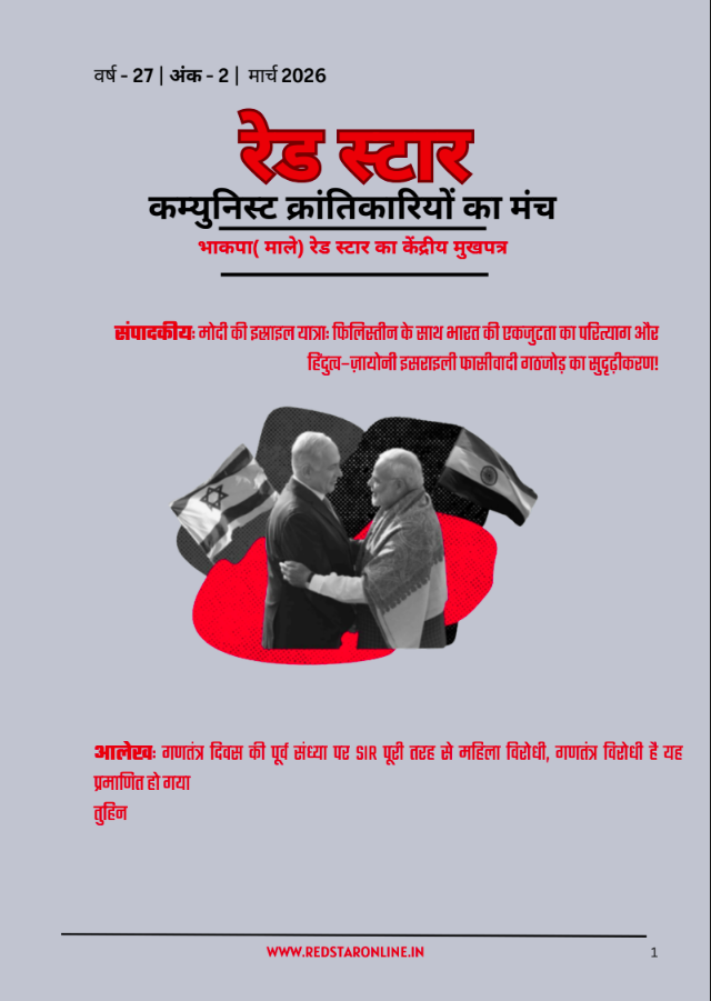FeaturedPeriodicalsRed Star Hindi Monthly Redstar Hindi – March 2026 Issue by admin March 6, 2026 written by admin March 6, 2026 For reading and donwloading the magazine, Click here…. 0 comment 0 FacebookTwitterPinterestEmail admin previous post Redstar English – March, 2026 – Issue Related Articles Redstar English – March, 2026 – Issue March 1, 2026 The Comity of Nations Should Urgently Step in... February 28, 2026 Massive Protest by Farmers’ and Workers’ Organisations under... February 23, 2026 Strengthening Hindutva-Zionist Nexus Behind India’s Abstention from Latest... February 20, 2026 Demonstration Held in Raipur by Moolnivasi Sangh Chhattisgarh... February 20, 2026 CPI (ML) Red Star salutes the working class,... February 13, 2026 All India Workers’ Strike – Bilaspur, Chhattisgarh February 12, 2026 Red Star Magazine – February, 2026 Issue February 9, 2026 13th Party Congress of CPI (ML) Red Star February 5, 2026 Make the February 12 nationwide strike a success! February 5, 2026 Leave a Comment Cancel Reply Save my name, email, and website in this browser for the next time I comment.