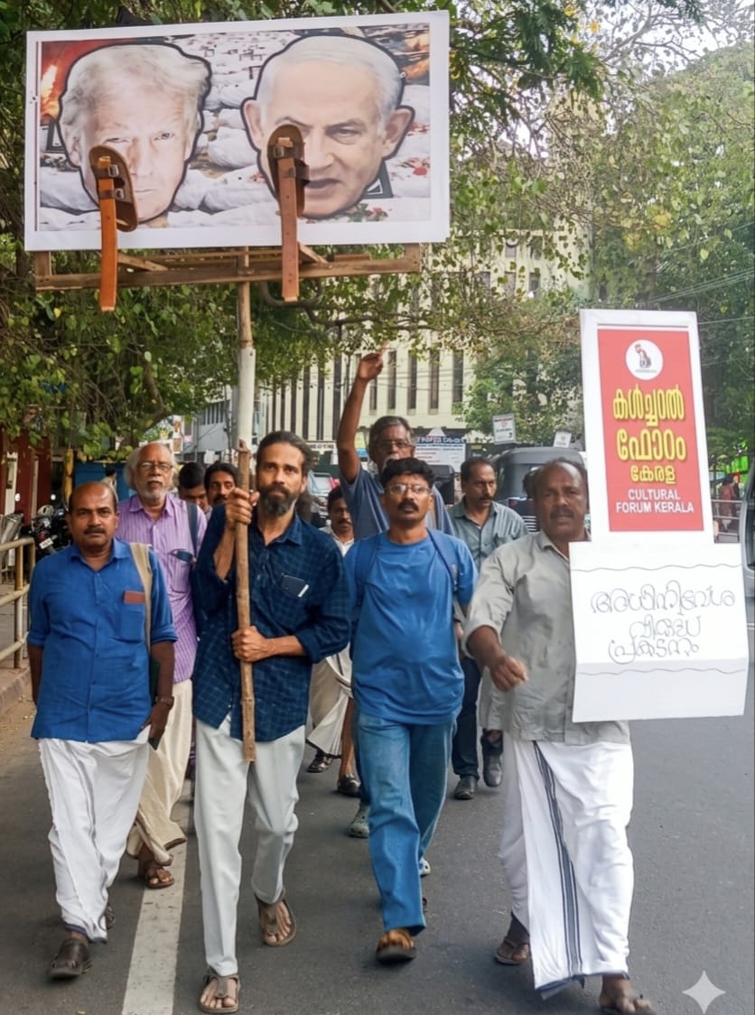 കൾച്ചറൽ ഫോറം പ്രതീകാത്മകമായി യുദ്ധക്കുറ്റവാളികളായ ട്രമ്പിന്റെയും നേതന്യാഹുവിന്റെയും കോലങ്ങൾക്ക് മേൽ ചെരുപ്പ് കൊണ്ടടിച്ച് പ്രകടനം നടത്തി.