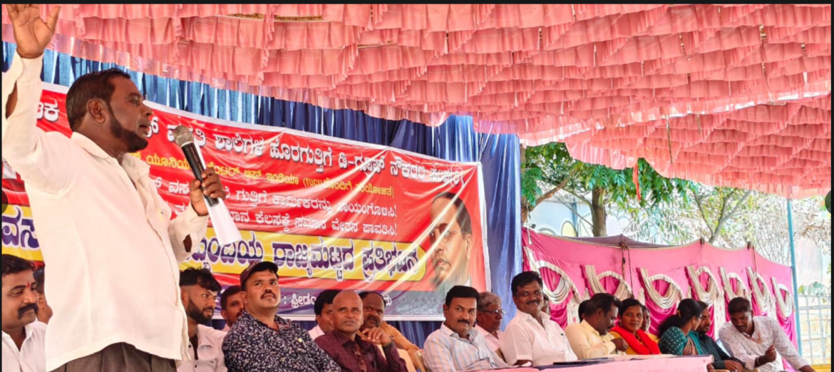കർണാടക സ്റ്റേറ്റ് റെസിഡൻഷ്യൽ സ്കൂൾ ഔട്ട്സോഴ്സ്ഡ് എംപ്ലോയീസ് യൂണിയന്റെ (TUCI) നേതൃത്വത്തിൽ, സംസ്ഥാനത്തെ എല്ലാ ജില്ലകളിൽ നിന്നുമുള്ള കരാർ തൊഴിലാളികൾ 2026 ഏപ്രിൽ 15-ന് തലസ്ഥാനമായ ബെംഗളൂരുവിലെ ഫ്രീഡം പാർക്കിൽ ദിവസം മുഴുവൻ പ്രതിഷേധം നടത്തി.